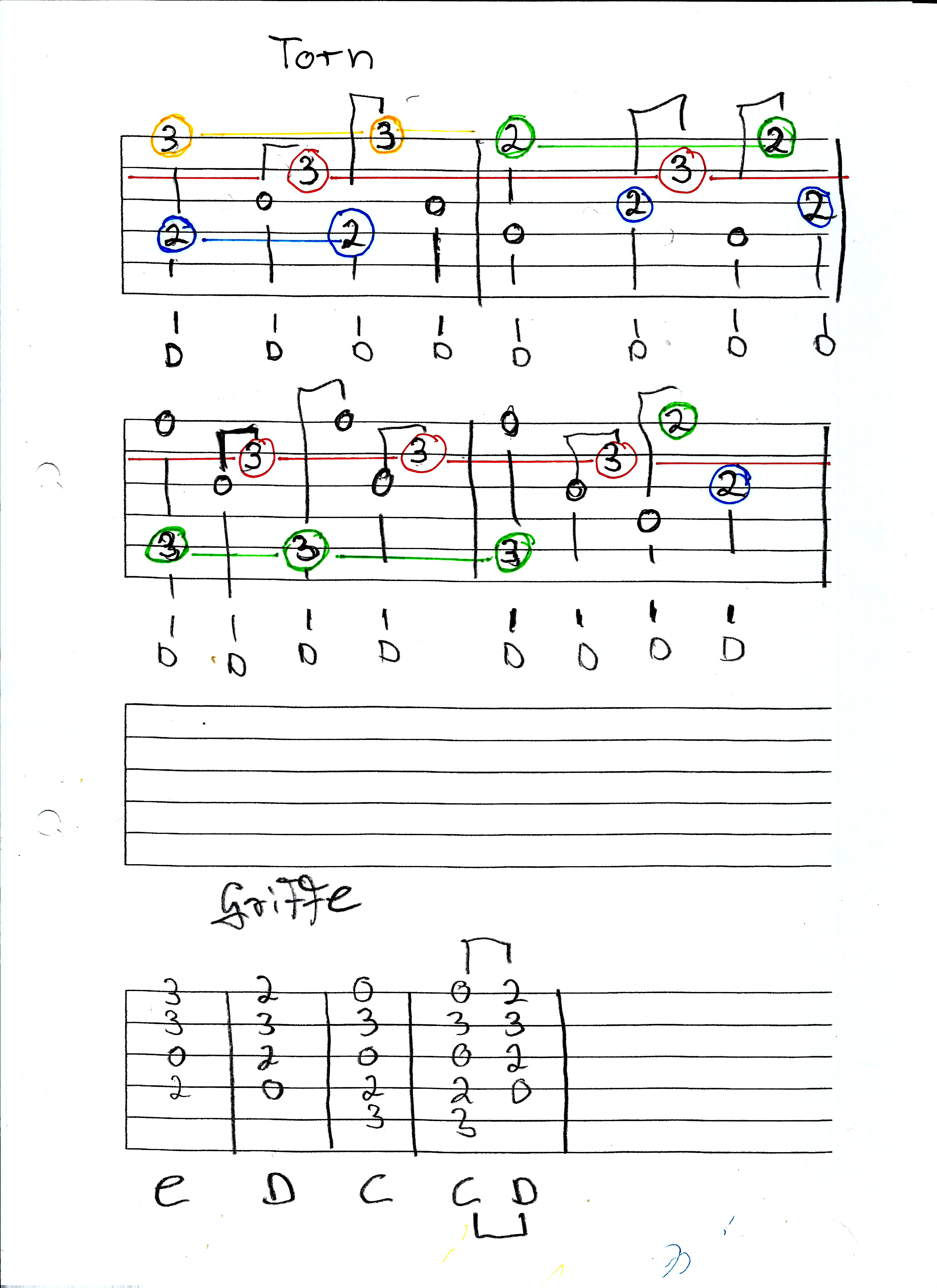 Torn, ein Lied mit durchgehendem und sich wiederholendem Zupfmuster im Fingerpicking - Stil. Bei dieser Art Zupfmuster spielt der Daumen (D) einen durchgehenden Wechselbass, während die anderen Finger Füllstimmen spielen. Wenn Du noch keine Erfahrung mit dieser Art des Zupfens hast, solltest Du zuerst versuchen, nur den Bass separat zu üben und die restlichen Finger später hinzu fügen. So erlangst Du einen gleichbleibenden Rhythmus, der das Lied trägt. Der Fingerpicking - Stil wird von sehr vielen Singer/Songwritern benutzt; kann als Standard bezeichnet werden und wird Dir bei sehr vielen Songs begegnen.